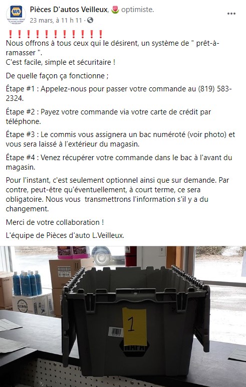 Voici un exemple de ces bonnes pratiques sur le Facebook de Pièces d'Autos Veilleux, à Lac-Mégantic :